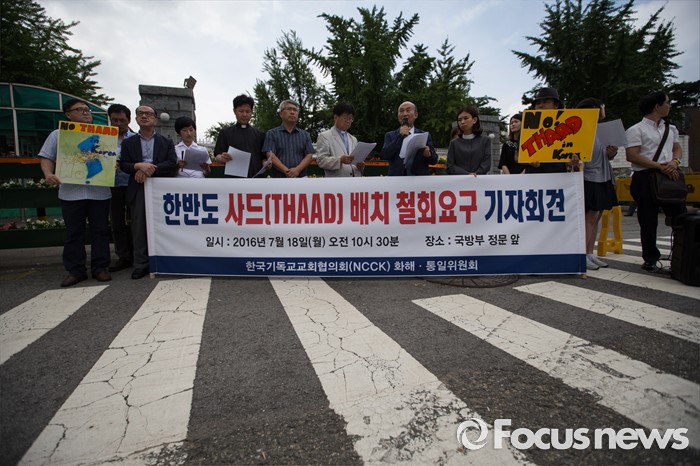 (서울=포커스뉴스) 한국 기독교교회협의회 관계자들이 18일 오전 서울 용산구 국방부 앞에서 사드 배치 반대 기자회견을 하고 있다.