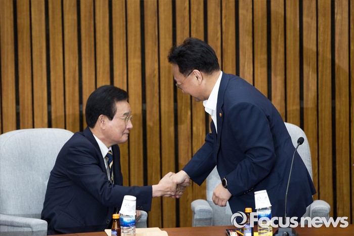 (서울=포커스뉴스) 변재일(왼쪽) 더불어민주당 정책위의장과 유일호 경제부총리 겸 기획재정부 장관이 18일 오전 서울 여의도 국회에서 열린 '3당 정책위의장-경제부총리, 3차 민생경제 현안점검회의'에 참석해 악수 하고 있다.