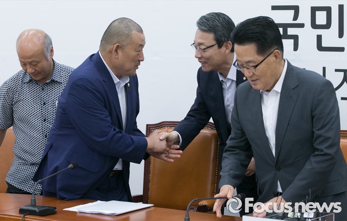 (서울=포커스뉴스) 박지원(오른쪽 첫번째) 국민의당 비상대책위원장, 김성식(오른쪽 두번째) 정책위의장이 18일 오후 서울 여의도 국회에서 열린 성주군 사드 저지 투쟁위원회 등 관련단체와 면담에 앞서 노광희(왼쪽 두번째) 성주군의회 의원과 인사하고 있다.