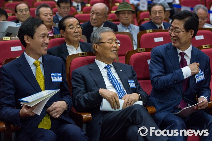 (서울=포커스뉴스) 김종인(가운데) 더불어민주당 비상대책위 대표와 우상호(왼쪽) 원내대표, 양승조 의원이 18일 오후 서울 여의도 국회의원회관에서 열린 '더불어민주당 중앙위원회의'에 참석해 대화 하고 있다.