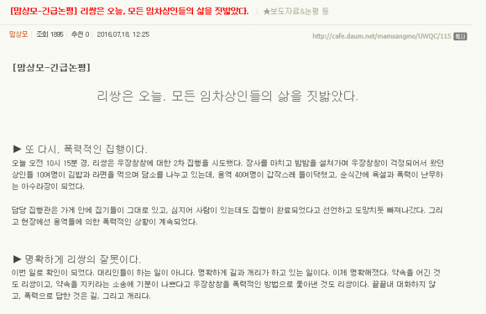 이어 "'우장창창'의 싸움은 절대 포기할 수 없는 싸움"이라며 "우리는 반드시 진실을 알리고, 리쌍이 사과할 때까지 싸울 것"이라고 말했다.리쌍의 강제철거 집행을 비판하는 '맘편히장사하고픈상인모임' 긴급 논평. <출처=맘상모 블로그>