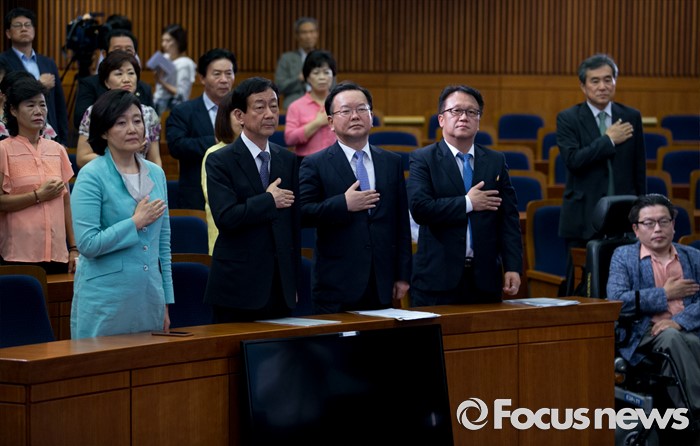 (서울=포커스뉴스) 18일 오후 서울 여의도 국회 헌정기념관에서 한국적 제3의 길 후원으로 열린 '개헌을 말하다 의원 대담, 어떤 헌법인가?'에 참석한 박영선, 진영, 김부겸, 민병두 더불어민주당 의원, 이상돈 국민의당 의원 등이 국기에 대한 경례를 하고 있다.