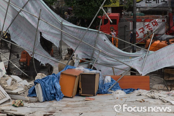(서울=포커스뉴스) 18일 오후 서울 서대문구 홍은동 한 공사장에서 붕괴사고가 일어나 소방대원들이 구조작업을 벌이고 있다. 소방당국은 붕괴된 건물 지하에 1명이 매몰되어 있다고 밝혔다.