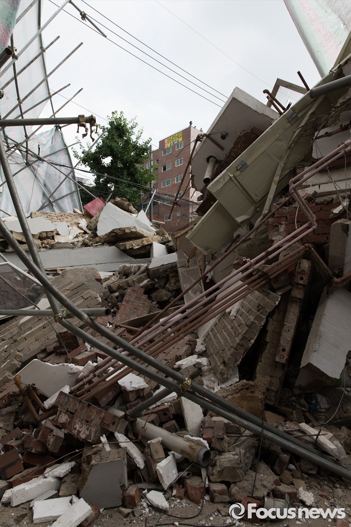 (서울=포커스뉴스) 18일 오후 서울 서대문구 홍은동 한 공사장 건물이 붕괴되어 있다. 소방당국은 붕괴된 건물 지하에 1명이 매몰되어 있다고 밝혔다.