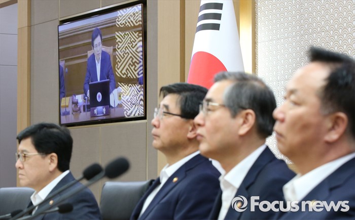 (세종=포커스뉴스) 19일 오전 세종시 정부세종청사 국무회의장에서 서울-세종 간 영상회의로 열린 국무회의에 참석한 국무위원들이 황교안 국무총리의 발언을 경청하고 있다. 왼쪽부터 정진엽 보건복지부장관, 이기권 고용노동부장관, 정재찬 공정거래위원장,김동극 인사혁신처장.