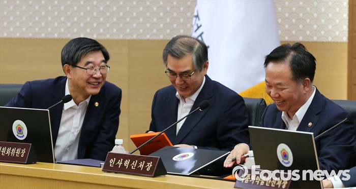 (세종=포커스뉴스) 19일 오전 세종시 정부세종청사 국무회의장에서 서울-세종 간 영상회의로 열린 국무회의에 참석한 이기권(왼쪽부터) 고용노동부장관이 정재찬 공정거래위원장, 김동극 인사혁신처장과 대화하고 있다.