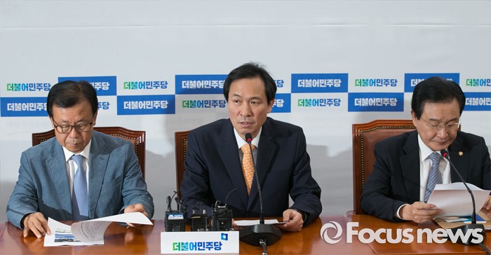 (서울=포커스뉴스) 19일 오전 서울 여의도 국회에서 열린 더불어민주당 사드대책위원회의에 참석한 우상호 원내대표가 모두발언을 하고 있다.