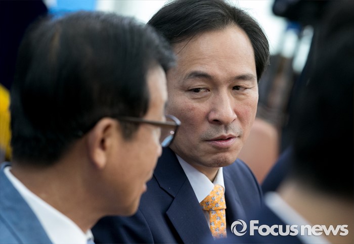 (서울=포커스뉴스) 19일 오전 서울 여의도 국회에서 열린 더불어민주당 사드대책위원회의에 참석한 우상호(가운데) 원내대표와 원혜영(왼쪽) 의원이 대화하고 있다.