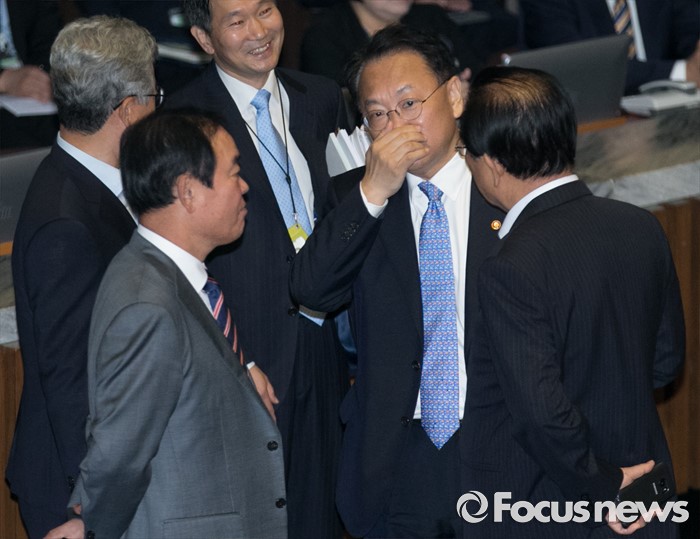 (서울=포커스뉴스) 19일 오전 서울 여의도 국회에서 열린 344회 국회(임시회) 1차 본회의, 사드(THAAD·고고도미사일방어체계) 배치에 대한 긴급현안질문에 참석한 유일호 경제부총리 겸 기획재정부 장관이 의원들과 대화하고 있다.