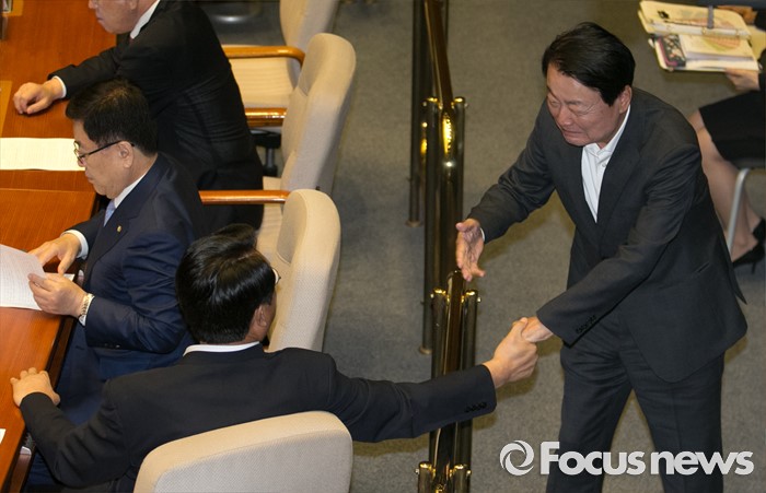 (서울=포커스뉴스) 19일 오전 서울 여의도 국회에서 열린 344회 국회(임시회) 1차 본회의, 사드(THAAD·고고도미사일방어체계) 배치에 대한 긴급현안질문에 참석한 정진석(왼쪽) 새누리당 원내대표와 전당대회 출마를 선언한 한선교 의원이 대화하고 있다.