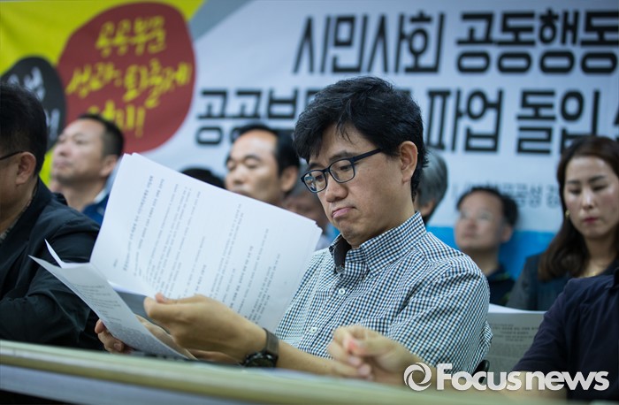(서울=포커스뉴스) 19일 오전 서울 중구 민주노총 대회의실에서 시민 사회 공동행동 출범 및 공공부문노조 파업 돌입 선언 기자회견이 열리고 있다. 공공성 강화와 공공부문 성과·퇴출제 저지 시민사회공동 행동은 9월 27일까지 성과연봉제, 민영화 정책 중단이 없으면 공공기관 노동자 6만명이 무기한 전면 파업에 돌입 한다고 밝혔다.