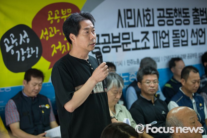 (서울=포커스뉴스) 19일 오전 서울 중구 민주노총 대회의실에서 시민 사회 공동행동 출범 및 공공부문노조 파업 돌입 선언 기자회견이 열리고 있다. 공공성 강화와 공공부문 성과·퇴출제 저지 시민사회공동 행동은 9월 27일까지 성과연봉제, 민영화 정책 중단이 없으면 공공기관 노동자 6만명이 무기한 전면 파업에 들어가겠다고 밝혔다.