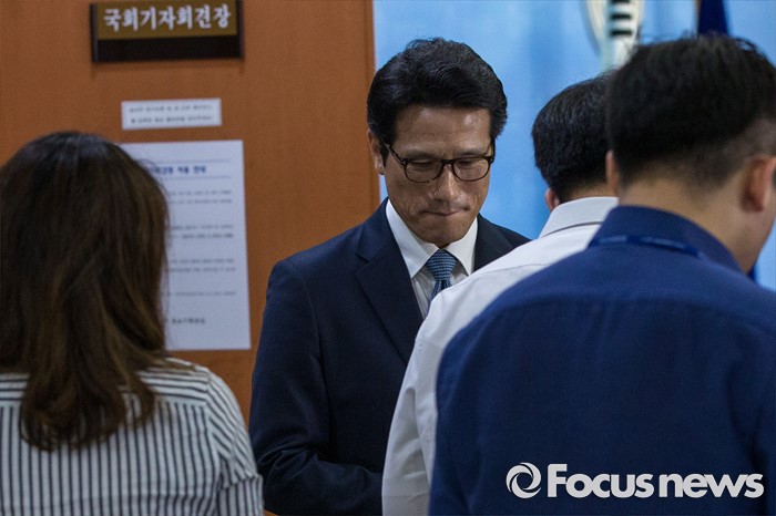| △ 기자회견장 나서는 정병국 새누리당 의원 |