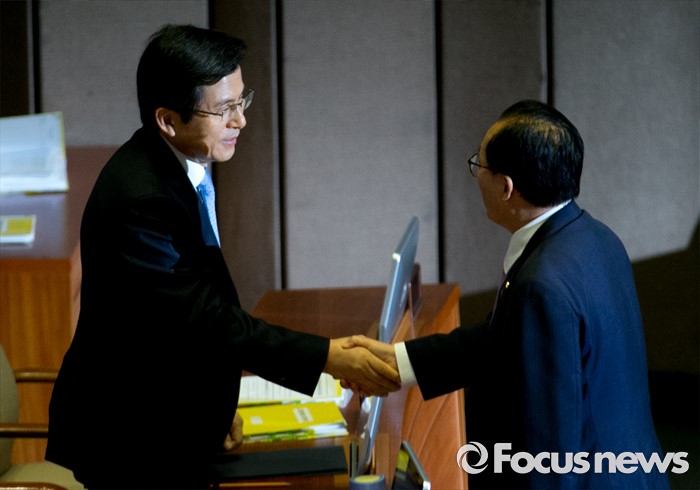 (서울=포커스뉴스) 19일 오전 서울 여의도 국회에서 344회 국회(임시회) 1차 본회의, 사드(THAAD·고고도미사일방어체계) 배치에 대한 긴급현안질문을 마친 황교안(왼쪽) 국무총리와 이채익 새누리당 의원이 악수하고 있다.