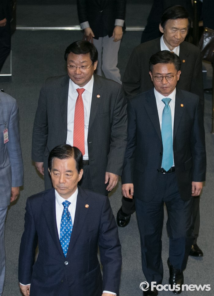 (서울=포커스뉴스) 19일 오전 서울 여의도 국회에서 344회 국회(임시회) 1차 본회의, 사드(THAAD·고고도미사일방어체계) 배치에 대한 긴급현안질문을 마친 뒤 한민구 국방부 장관, 홍용표 통일부 장관, 윤병세 외교부 장관, 주형환 산업통상자원부 장관이 퇴장하고 있다.