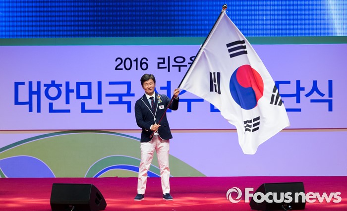 (서울=포커스뉴스) 19일 오후 서울 송파구 올림픽공원 올림픽홀에서 열린 2016 리우올림픽 대한민국 선수단 결단식에서 정몽규 대한민국 선수단장이 단기를 수여 받고 흔들어보이고 있다.