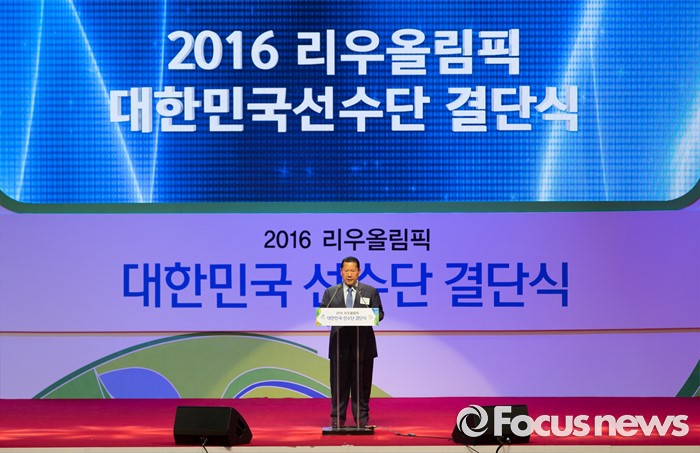 (서울=포커스뉴스) 19일 오후 서울 송파구 올림픽공원 올림픽홀에서 열린 2016 리우올림픽 대한민국 선수단 결단식에서 김정행 대한체육회 회장이 개회사를 하고 있다.