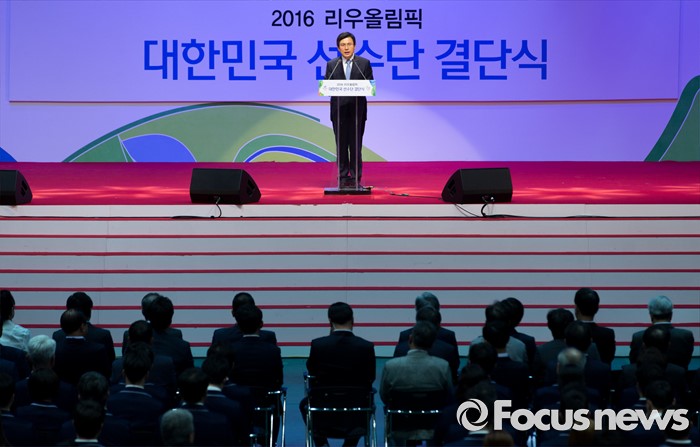 (서울=포커스뉴스) 19일 오후 서울 송파구 올림픽공원 올림픽홀에서 열린 2016 리우올림픽 대한민국 선수단 결단식에서 황교안 국무총리가 격려사를 하고 있다.