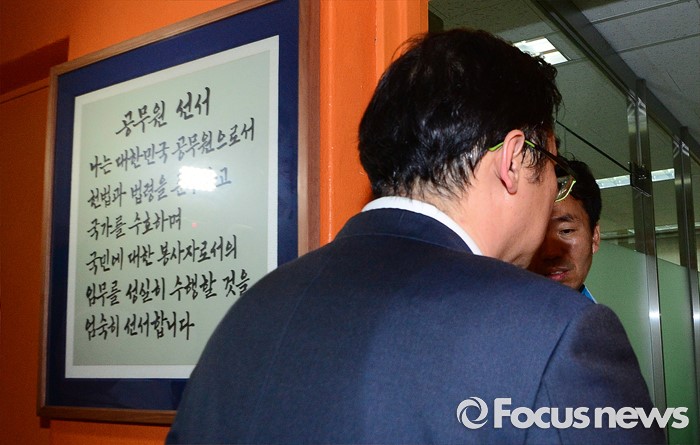 (서울=포커스뉴스) '민중은 개·돼지' 발언으로 파문을 일으킨 나향욱 전 교육부 정책기획관이 19일 오후 중앙징계위원회에 참석하고 있다.