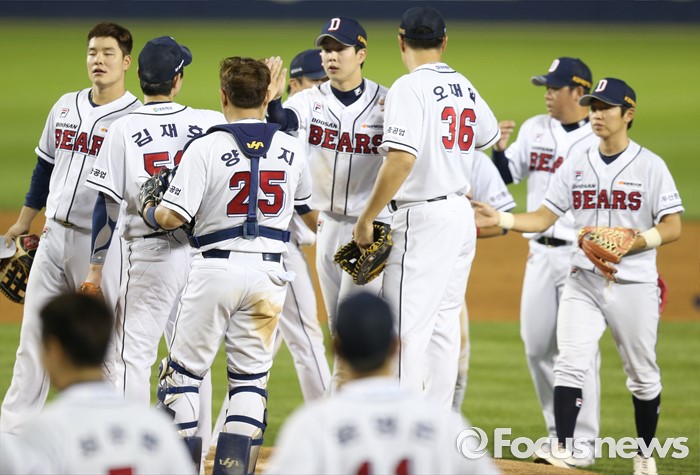 (서울=포커스뉴스) 19일 서울 잠실구장에서 열린 2016 프로야구 삼성-두산 경기에서 시즌 후반 첫 경기를 승리로 장식하며 산뜻한 출발을 한 두산 선수들이 마운드에 모여 하이파이브를 하고 있다.