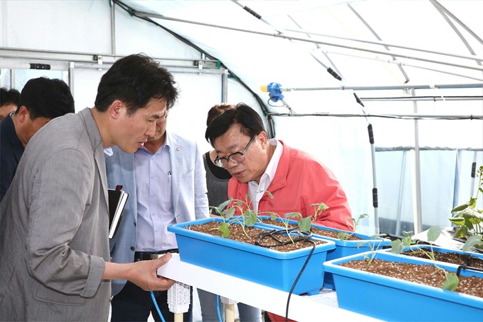 (세종=포커스뉴스) 이동필 농림축산식품부장관이 19일 세종시 조치원읍 세종 창조경제혁신센터를 찾아 출범 1주년 추진성과를 점검하고 연동형 온실교육장, 스마트팜 등을 현장 점검하고 있다. <사진제공=농림축산식품부>