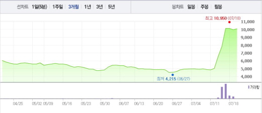 이는 2주일 전 주가인 6일(4930원)과 비교했을 때 104.8% 상승한 수치다.