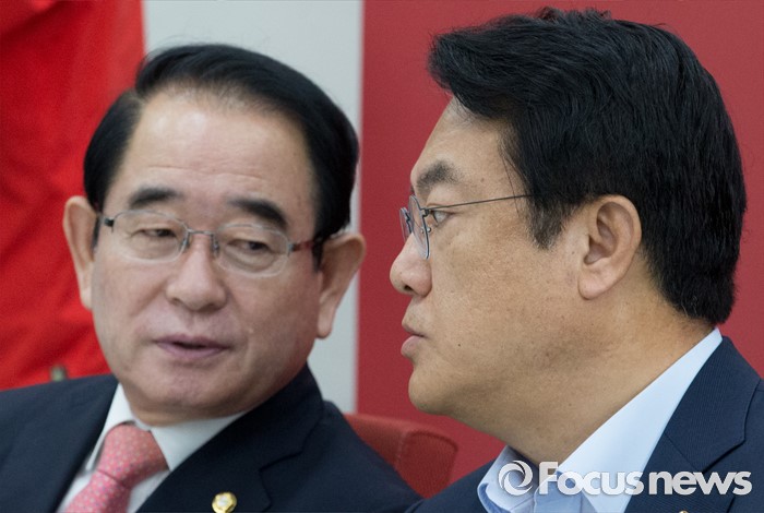 (서울=포커스뉴스) 20일 오전 서울 여의도 국회에서 열린 새누리당 혁신비상대책위원회의에 참석한 정진석(오른쪽) 원내대표와 박명재 사무총장이 대화하고 있다.