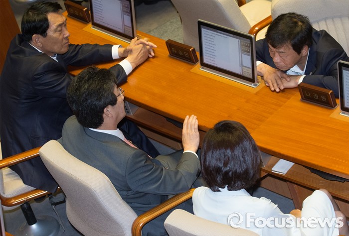 (서울=포커스뉴스) 20일 오전 서울 여의도 국회에서 열린 344회 국회(임시회) 2차 본회의, 사드(THAAD·고고도미사일방어체계) 배치에 대한 긴급현안질문에 참석한 이완영, 유승민, 나경원, 안상수 새누리당 의원 등이 대화하고 있다.