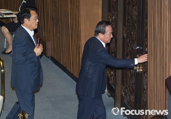 (서울=포커스뉴스) 20일 오전 서울 여의도 국회에서 열린 344회 국회(임시회) 2차 본회의, 사드(THAAD·고고도미사일방어체계) 배치에 대한 긴급현안질문에 참석한 정진석(왼쪽) 새누리당 원내대표와 서청원 의원이 대화를 위해 이동하고 있다.