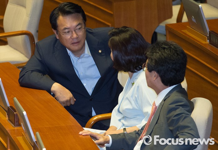 (서울=포커스뉴스) 20일 오전 서울 여의도 국회에서 열린 344회 국회(임시회) 2차 본회의, 사드(THAAD·고고도미사일방어체계) 배치에 대한 긴급현안질문에 참석한 정진석(왼쪽부터) 새누리당 원내대표, 나경원, 유승민 의원이 대화하고 있다.