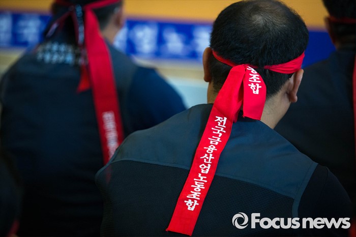(서울=포커스뉴스) 20일 오전 서울 중구 은행회관에서 금융노조의 '성과연봉제 도입 관련 총파업 1차 결의대회' 가 열리고 있다.