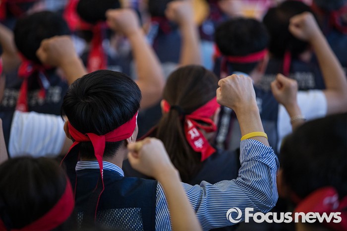 (서울=포커스뉴스) 20일 오전 서울 중구 은행회관에서 금융노조의 '성과연봉제 도입 관련 총파업 1차 결의대회' 가 열리고 있다.