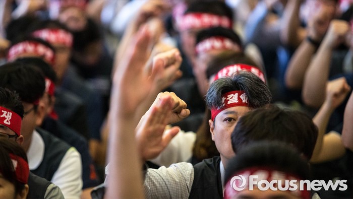 (서울=포커스뉴스) 20일 오전 서울 중구 은행회관에서 열린 '성과연봉제 도입 관련 총파업 1차 결의대회' 에 참석한 금융노조 노조원들이 구호를 외치고 있다.