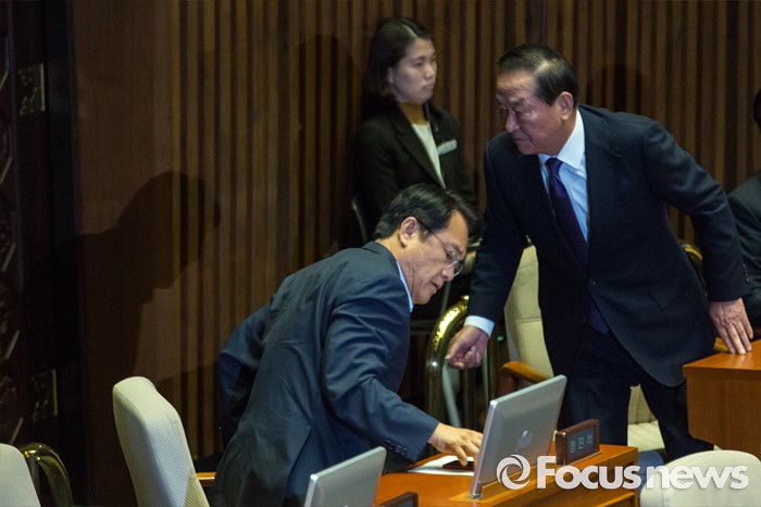 (서울=포커스뉴스) 정진석(왼쪽) 새누리당 원내대표와 서청원 의원이 20일 오전 서울 여의도 국회에서 열린 344회 국회(임시회) 2차 본회의, 사드(THAAD, 고고도미사일방어체계) 배치에 대한 긴급현안질문에 참석해 대화 하기 위해 일어서고 있다.