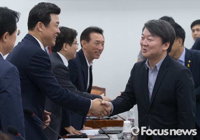 (서울=포커스뉴스) 20일 오전 서울 여의도 국회에서 열린 미래일자리 특별위원회 전체회의에 참석한 안철수(오른쪽) 국민의당 전 대표와 윤영석 새누리당 의원 등이 인사하고 있다.