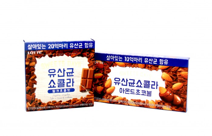 롯데제과가 출시한 '김치 유산균 초콜릿'은 '유산균쇼콜라 밀크초콜릿'과 '유산균쇼콜라 아몬드초코볼' 2종이다.