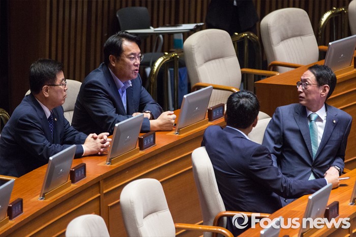 (서울=포커스뉴스) 정진석(왼쪽 두 번째) 새누리당 원내대표와 김도읍(오른쪽) 새누리당 원내수석부대표가 20일 오전 서울 여의도 국회에서 열린 344회 국회(임시회) 2차 본회의, 사드(THAAD, 고고도미사일방어체계) 배치에 대한 긴급현안질문에 참석해 대화하고 있다.