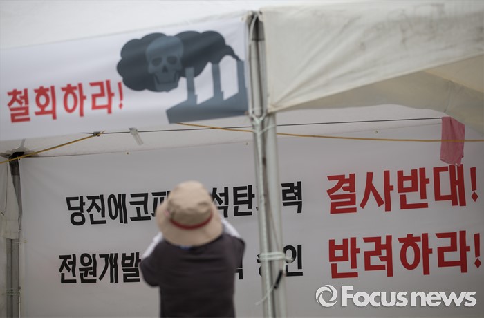 (서울=포커스뉴스) 당진시 송전선로 석탄화력 저지 범시민대책위원회 관계자들과 환경단체 회원들이 20일 오전 서울 종로구 광화문 광장에서 당진 에코파워 석탄화력발전소에 대한 전원개발실시계획 승인 신청 반려를 촉구하고 있다.