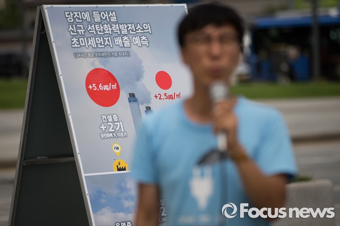 (서울=포커스뉴스) 당진시 송전선로 석탄화력 저지 범시민대책위원회 관계자들과 환경단체 회원들이 20일 오전 서울 종로구 광화문 광장에서 당진 에코파워 석탄화력발전소에 대한 전원개발실시계획 승인 신청 반려를 촉구하고 있다.
