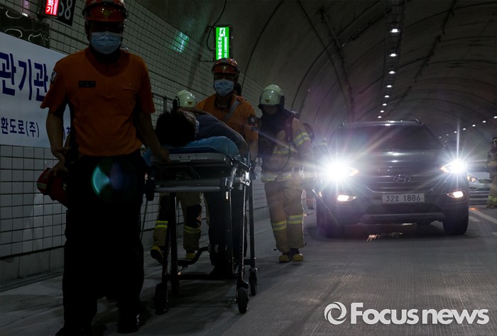 (서울=포커스뉴스) 20일 오후 서울 관악구 봉천터널 내에서 서초소방서, 방배경찰서 대원들이 강남순환도로 화재대응 유관기관 합동훈련을 하고 있다.