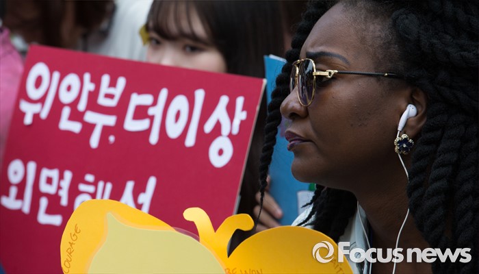 (서울=포커스뉴스) 20일 오후 서울 종로구 옛 일본대사관 앞에서 열린 제1240차 일본군 위안부 문제해결을 위한 정기 수요집회에 참석한 한 외국인이 참석해 있다.