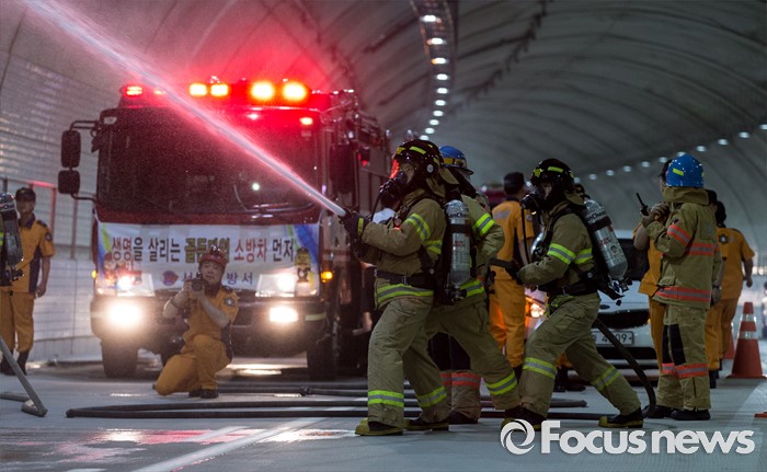(서울=포커스뉴스) 20일 오후 서울 관악구 봉천터널 내에서 서초소방서, 방배경찰서 대원들이 강남순환도로 화재대응 유관기관 합동훈련을 하고 있다.