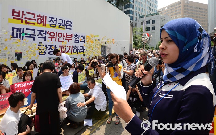 (서울=포커스뉴스) 20일 오후 서울 종로구 옛 일본대사관 앞에서 열린 제1240차 일본군 위안부 문제해결을 위한 정기 수요집회에서이화글로벌파워먼트 프로그램 참석중인 한 여성활동가가 자유발언을 하고 있다.