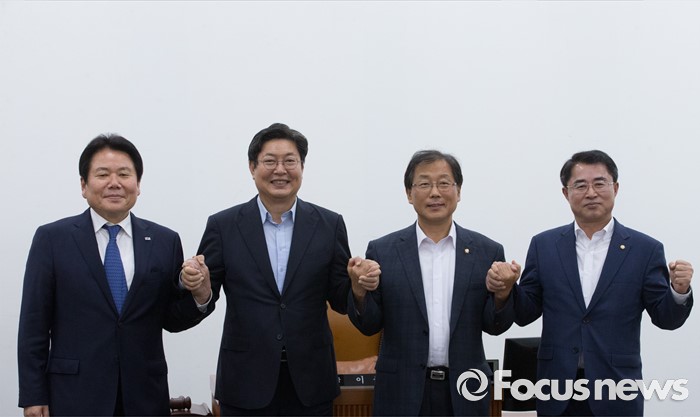 (서울=포커스뉴스) 20일 오후 서울 여의도 국회에서 열린 남북관계개선 특별위원회 전체회의에 참석한 이춘석 위원장과 3당 간사가 취재진을 향해 포즈를 취하고 있다. 왼쪽부터 정양석 새누리당 간사, 이 위원장, 윤후덕 더불어민주당 간사, 최경환 국민의당 간사.