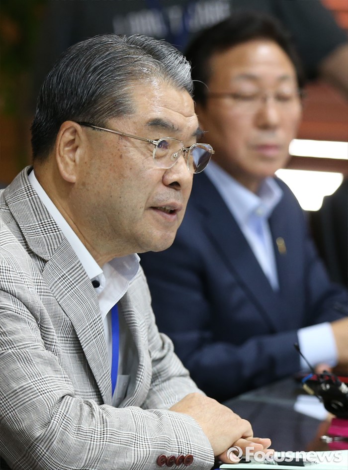 (세종=포커스뉴스) 20일 오후 세종시 정부세종청사 교육부 접견실에서 열린 이준식 사회부총리 겸 교육부장관과 새롭게 구성된 전국시도교육감협의회 회장단 간담회에서 이재정 협의회장이 인사말을 하고 있다. 오른쪽은 민병희 강원도교육감.