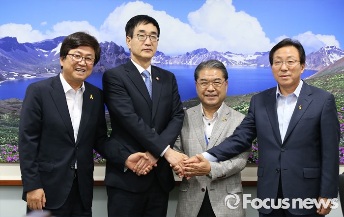 (세종=포커스뉴스) 이준식 사회부총리 겸 교육부장관이 20일 오후 세종시 정부세종청사 교육부 접견실에서 새롭게 구성된 전국시도교육감협의회 회장단과 간담회를 갖기 앞서 악수를 하며 기념촬영하고 있다. 왼쪽부터 최교진 세종시교육감, 이준식 부총리, 이재정 협의회장, 민병희 강원도교육감.