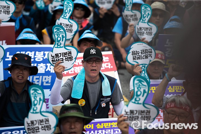 (서울=포커스뉴스) 20일 오후 서울 여의도 산업은행 앞에서 '민주노총 총파업 총력투쟁' 결의대회가 열리고 있다. 이번 결의대회에서 민노총 조합원들은 한상균 민노총 위원장 실형선고, 성과연봉제 등을 규탄했다.