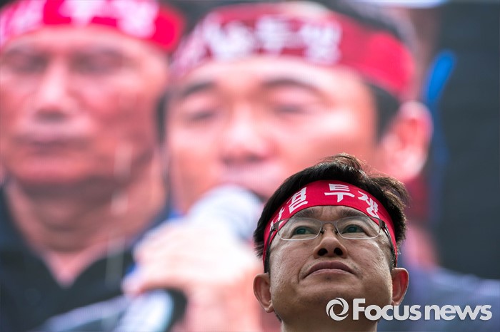 (서울=포커스뉴스) 20일 오후 서울 여의도 산업은행 앞에서 '민주노총 총파업 총력투쟁' 결의대회가 열리고 있다. 이번 결의대회에서 민노총 조합원들은 한상균 민노총 위원장 실형선고, 성과연봉제 등을 규탄했다.