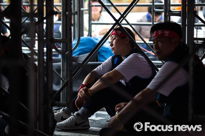 (서울=포커스뉴스) 20일 오후 서울 여의도 산업은행 앞에서 '민주노총 총파업 총력투쟁' 결의대회가 열리고 있다. 이번 결의대회에서 민노총 조합원들은 한상균 민노총 위원장 실형선고, 성과연봉제 등을 규탄했다.