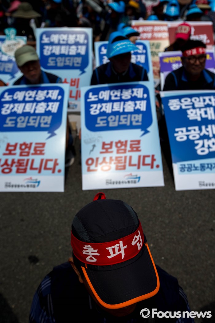 (서울=포커스뉴스) 20일 오후 서울 여의도 산업은행 앞에서 '민주노총 총파업 총력투쟁' 결의대회가 열리고 있다. 이번 결의대회에서 민노총 조합원들은 한상균 민노총 위원장 실형선고, 성과연봉제 등을 규탄했다.
